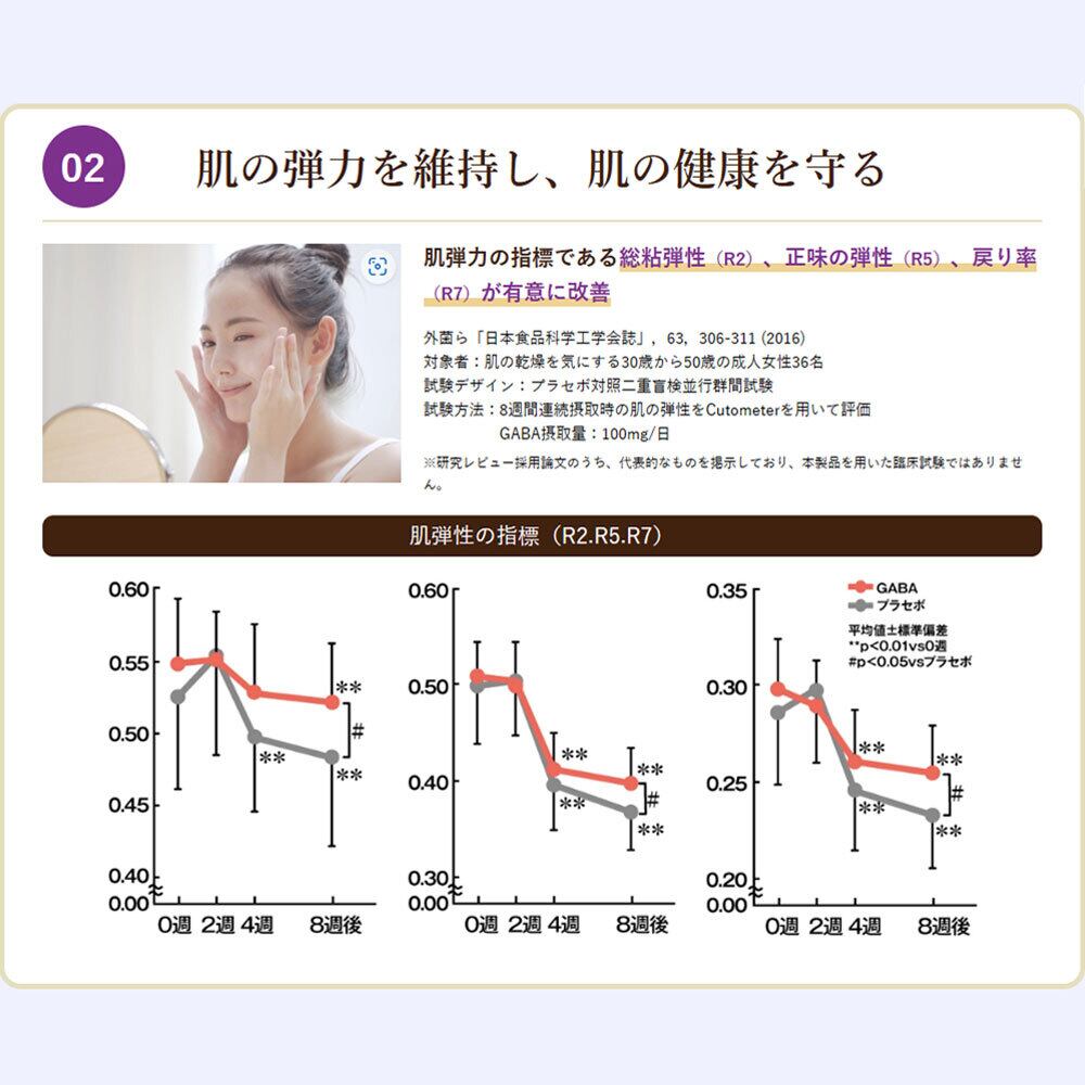 届出表示:本品にはGABAが含まれます。GABAには、睡眠の質(眠りの深さ)の向上に役立つ機能、すっきりとした目覚めをサポートする機能、肌の乾燥が気になる方の肌の弾力を維持し、肌の健康を守るのを助ける機能、仕事や勉強などによる一時的な精神的ストレスや疲労感を緩和する機能、一時的に落ち込んだ気分を前向きにする「活気・活力感(積極的な気分、いきいきとした気分、やる気など)の低下を軽減する」機能、血圧が高めの方の血圧を下げる機能があることが報告されています。